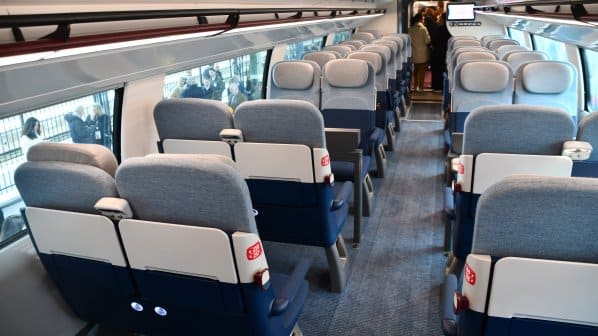 TGV M的內(nèi)飾以紅、白、藍(lán)三色為主色調(diào),即法國(guó)的國(guó)旗色。其中,一等座采用2+1配置,以紅色為主色調(diào),座椅比上一代寬50毫米,座椅靠背桌展開后可露出電源插座;二等座為2+2設(shè)計(jì),以藍(lán)色為主色調(diào),二等座的空間非常寬敞,腿部空間比上一代多出50毫米。全新的座椅形狀更加圓潤(rùn),采用了新型輕質(zhì)透氣泡沫材料,并配合上含85%羊毛纖維的針織面料,更易于清潔和更換。座椅下方有足夠的空間存放較小的行李。